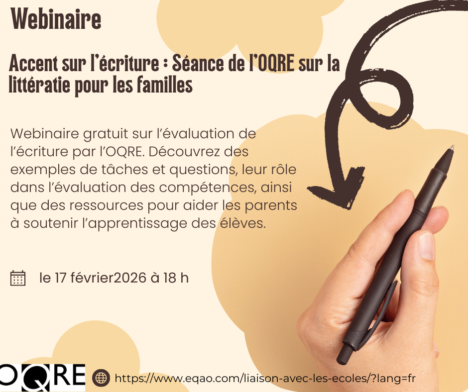 Ce 17 février, à 18 h, rejoignez-nous pour un webinaire gratuit en direct sur la façon dont l’OQRE évalue les compétences en écriture des élèves à des étapes clés de leur scolarité. Le personnel de l’OQRE discutera de tâches d’écriture et de questions tirées de la composante « Écriture » des tests des cycles primaire et moyen, ainsi que du test provincial de compétences linguistiques. Les participantes et participants découvriront comment ces tâches d’écriture et ces questions aident à évaluer les compétences que les élèves acquièrent en classe. Le personnel mettra également de l’avant des informations et des ressources précieuses qui peuvent aider les parents et les tutrices et tuteurs à soutenir l’apprentissage de leur enfant.