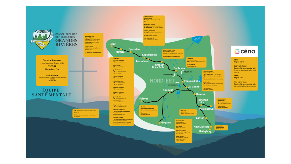 « Les ministères de l’Éducation et de la Santé se sont engagés à collaborer pour établir un continuum de soins de santé mentale et de lutte contre les dépendances dans les écoles, chez les fournisseurs de soins de santé mentale aux enfants et aux jeunes en milieu communautaire et dans les hôpitaux, qui soit coordonné, complet et adapté aux besoins de chaque élève. » (ministère de l’Éducation de l’Ontario, 2025) Cliquez ce lien pour en savoir plus sur la PPN 169 : Politique/Programmes Note 169 | Éducation en Ontario : Directives en matière de politiques et de programmes | ontario.ca