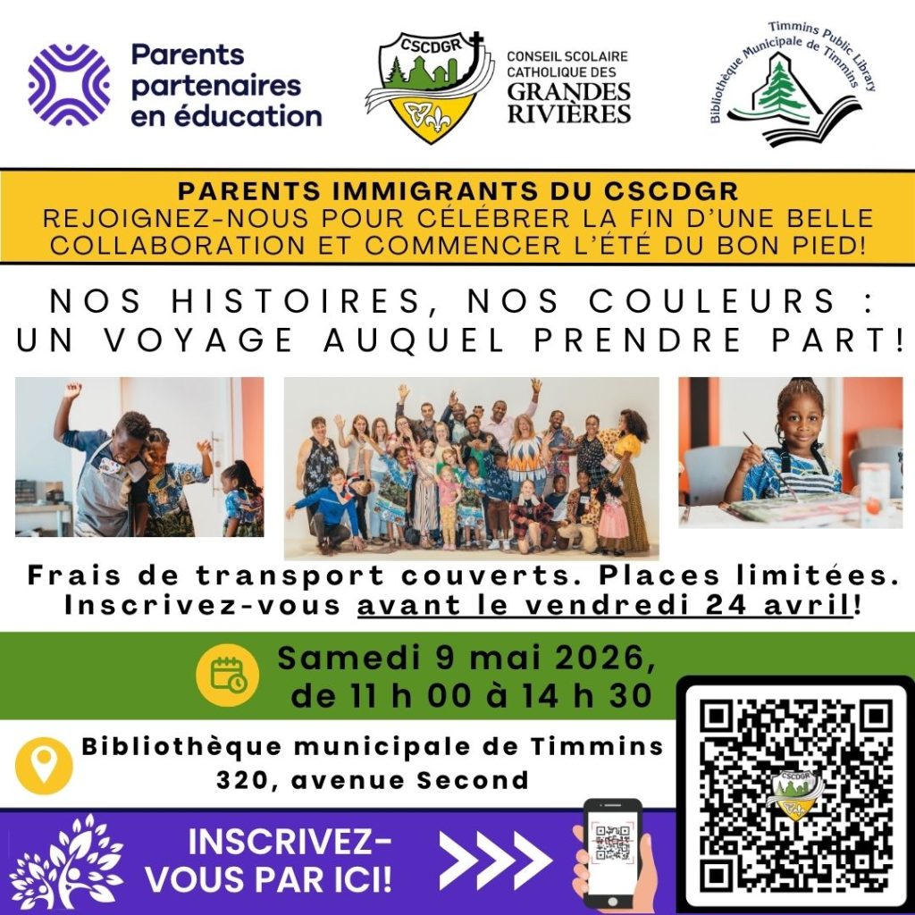 Veuillez prendre connaissance de cette affiche concernant l’activité « Nos histoires, nos couleurs : un voyage auquel prendre part » pour les parents immigrants, qui se tiendra le 9 mai prochain.